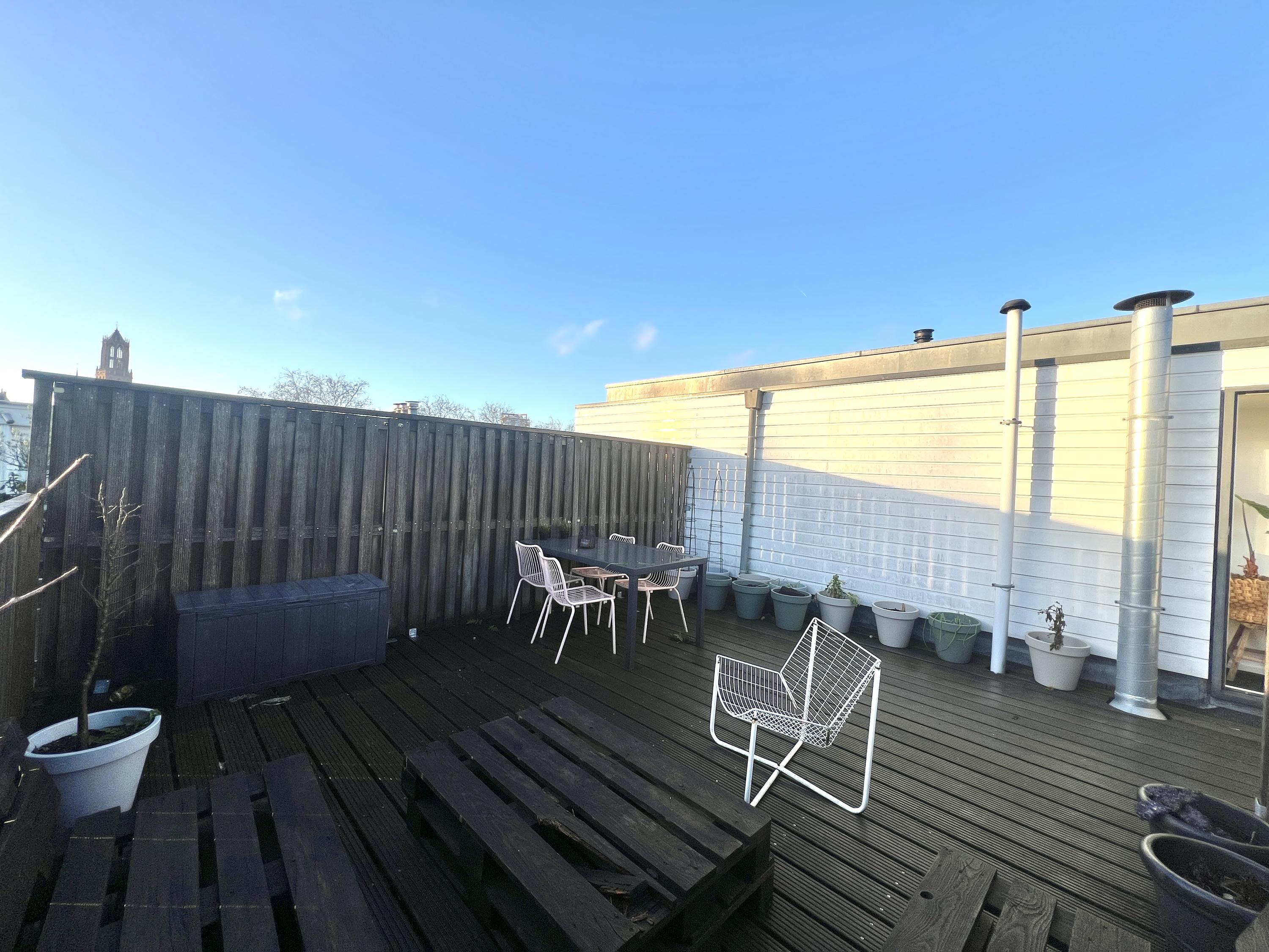 Uniek aan dit appartement is het gezamenlijke dakterras: een heerlijke plek om te ontspannen of samen te komen met buren. Vanaf het dakterras geniet je van een geweldig uitzicht op de iconische Domtoren, wat wonen op deze locatie extra bijzonder maakt.